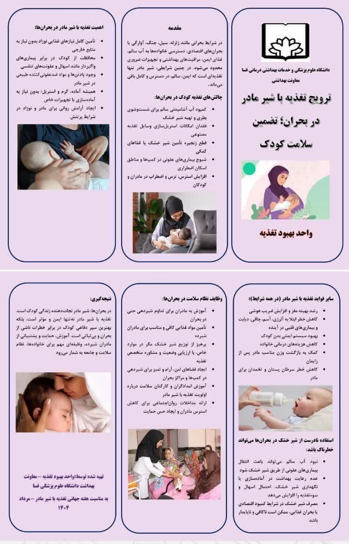 در بحران‌ها، شیر مادر نجات‌دهنده زندگی کودک است. تغذیه با شیر مادر نه‌تنها ایمن و مؤثر است، بلکه بهترین سپر دفاعی کودک در برابر خطرات ناشی از بحران و بی‌ثباتی است. آموزش، حمایت و پشتیبانی از مادران شیرده، وظیفه‌ای مهم برای خانواده‌ها، نظام سلامت و جامعه به شمار می‌رود.
