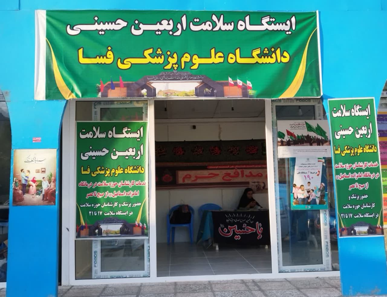 ایستگاه خدمات جهادی سلامت دانشگاه علوم پزشکی فسا با همکاری اداره اوقاف و امور خیریه و موکب شهدای مدافع حرم شهرستان جهت ارایه خدمات سلامت به زائرین اربعین حسینی مسیر شرق به غرب کشور برپا گردید و در اولین روز، ویزیت پزشک، مشاوره تغذیه و خدمات مشاوره خانواده به مراجعین ارایه گردید.