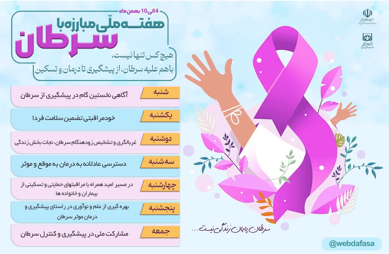 این هفته فرصتی برای تقویت آگاهی رسانی درباره سرطان، عوامل خطر، تشویق بیشتر به پیشگیری، غربالگری و تشخیص زودهنگام و حمایت از بیماران مبتلا با درمان به موقع و مراقبتهای حمایتی و تسکینی می باشد.