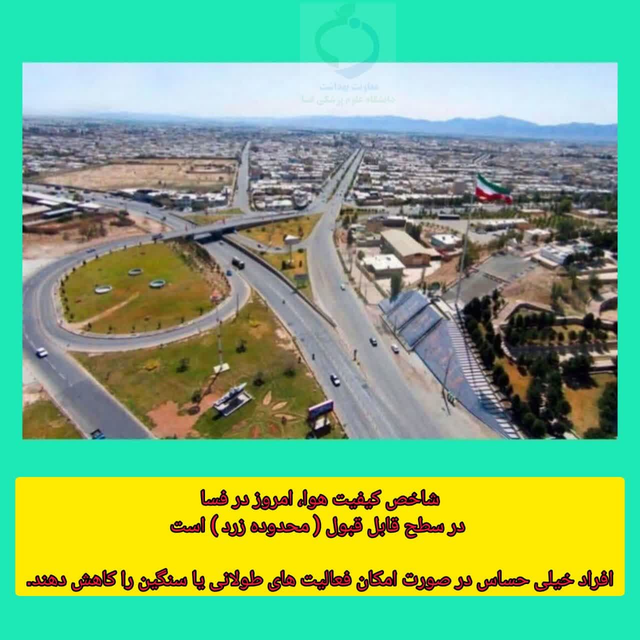 شاخص کیفیت هوا، امروز در فسا در سطح قابل قبول ( محدوده زرد ) است